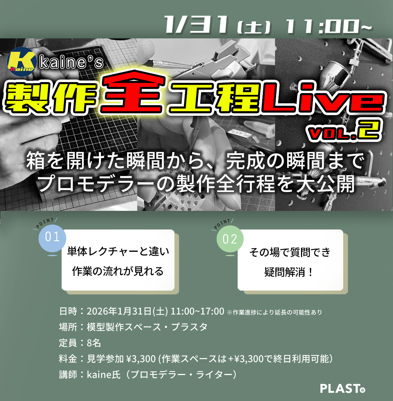 の2パターンが選択可能。カメラを仕込んでYouTubeライブ配信をしますので②の場合も常にkaine氏の手元やトークはスマホでリアルタイムに観れます。「あ!ここ!」みたいな時に隣に移動してじっくり見学したり質問したり、それ以外は製作をすすめる流れがオススメ参加スタイル(途中の移動は自由です!)♪