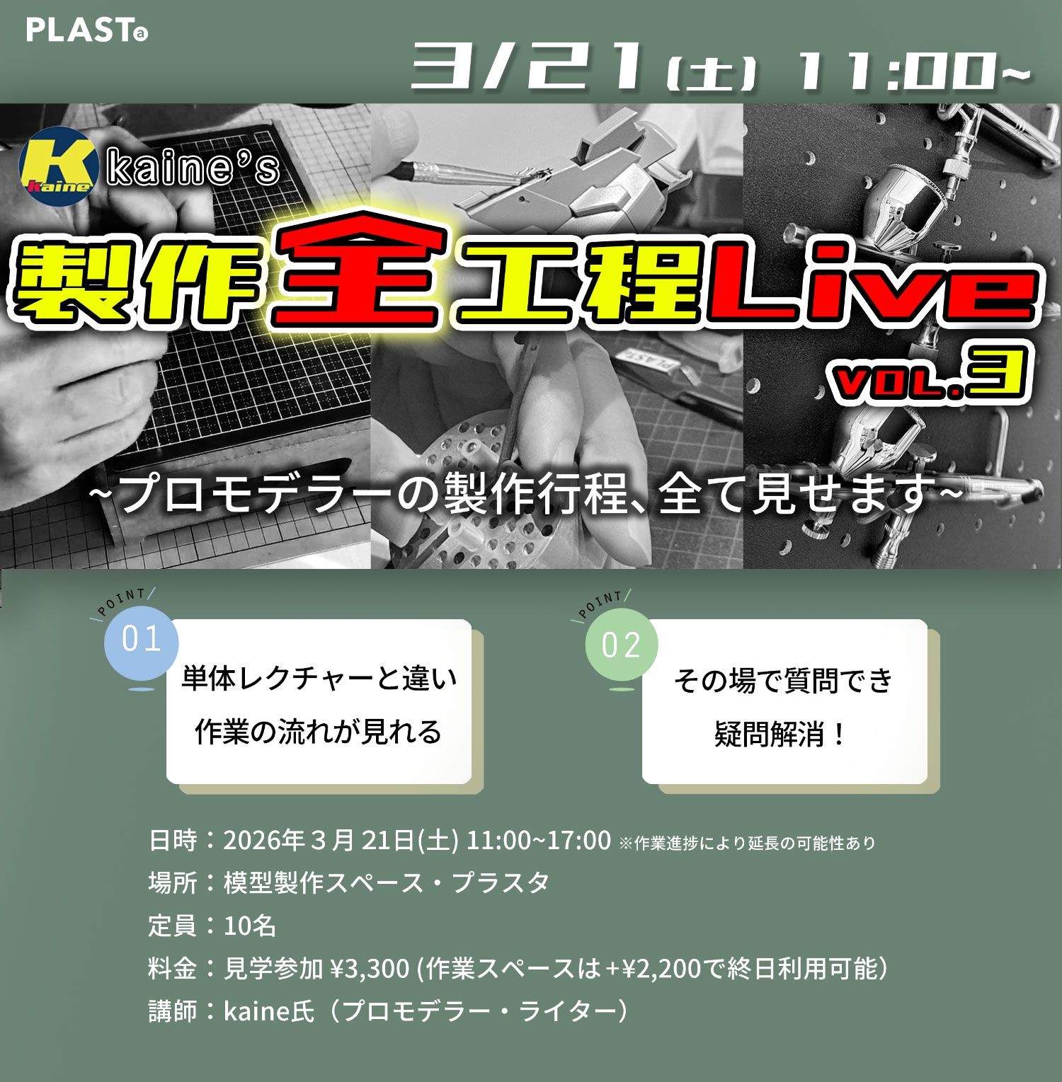 の2パターンが選択可能。手元を映したYouTubeライブ配信をしますので②の場合も常にkaine氏の手元やトークはスマホでリアルタイムに観れます。「あ!ここ!」みたいな時に隣に移動してじっくり見学したり質問したり、それ以外は製作をすすめる流れがオススメ参加スタイル(途中の移動は自由です!)♪