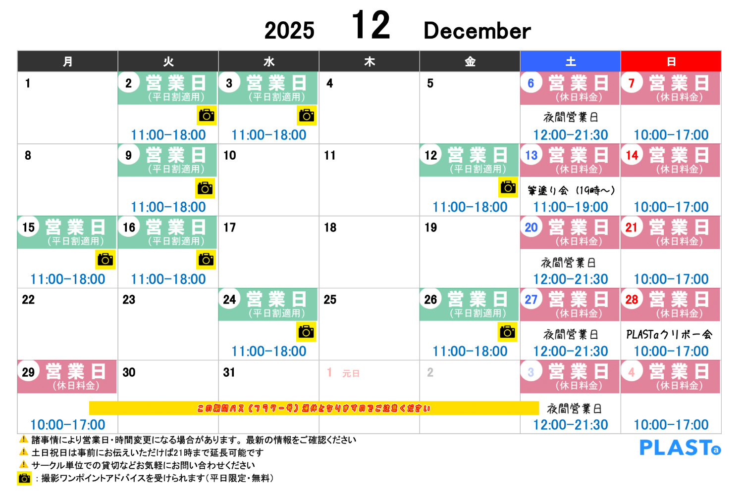 12月の夜間延長営業日(~21:30) : 12/6(土)、12/20(土)、12/27(土)