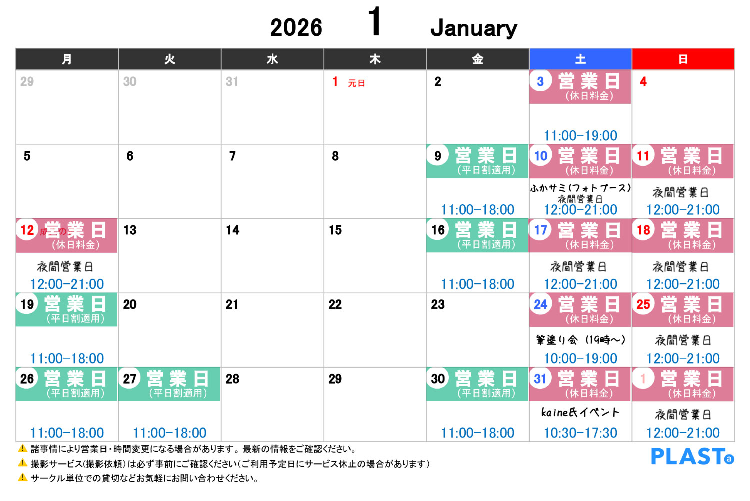 1月の夜間延長営業日(~21:00) : 1/10(土)、11(日)、17(土)、18(日)、25(日)